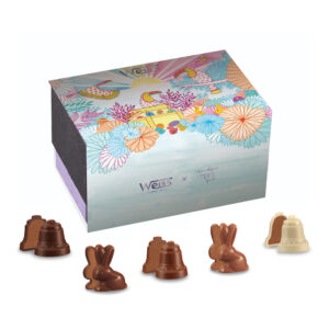 Ce coffret renferme des lapins et des cloches de Pâques aux coeurs pralinés onctueux enrobés de chocolat. Des trésors confectionnés avec des ingrédients nobles : des amandes Valencia d’Espagne et des noisettes Romaines d’Italie, puis enrobés de chocolat noir 67%, lait 41% ou blanc 29%.